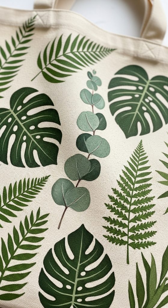 Botanical leaf patterns offer a refreshing and natural aesthetic that suits many styles. This design is perfect for those who love plants, gardening, or earthy minimalism. Start with a neutral tote bag and choose paint colors such as forest green, olive green, sage, and brown for stems or accents.