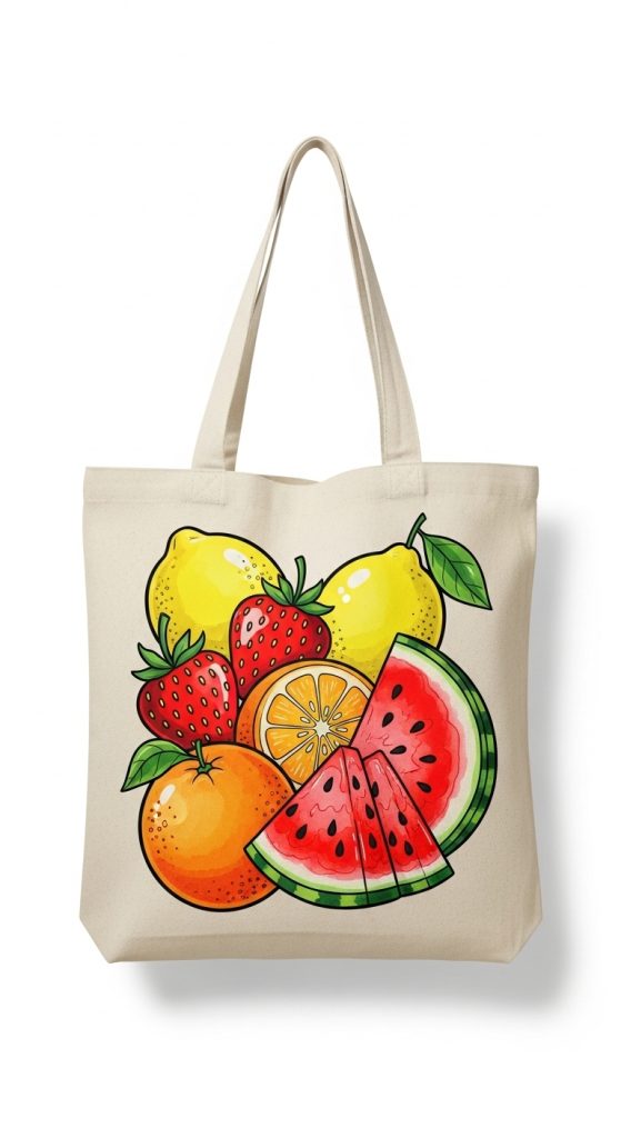 Fruit themed designs bring a cheerful and energetic vibe to tote bags. This idea works especially well for summer gifts or market shopping bags. Start by choosing bright and fresh colors like reds for strawberries, oranges for citrus slices, greens for watermelons, and yellows for pineapples. Wash and iron the tote bag, insert cardboard, and plan your layout by sketching the fruit shapes lightly.
