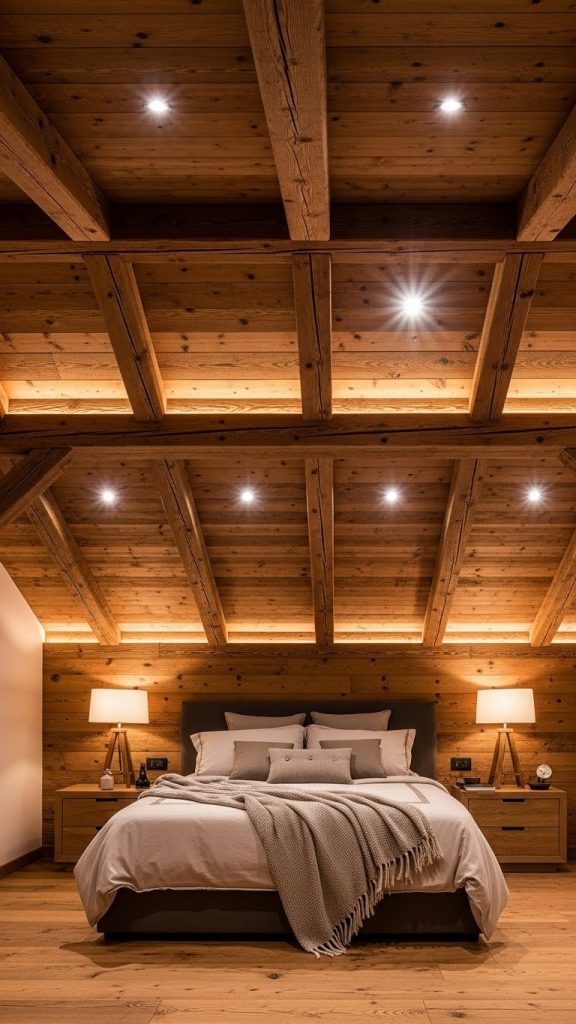 Coffered ceilings are a timeless design choice that brings a sense of depth and luxury to any bedroom. This design features a grid of recessed panels, which can be square, rectangular, or even hexagonal, adding a geometric charm to the room. Typically, coffered ceilings are constructed using gypsum boards or wood panels, which are easy to install and maintain. The recessed panels create natural shadows and depth, giving the bedroom a more spacious and elegant look. Lighting is a crucial element in coffered ceilings. Installing LED strips inside the recesses can create soft, ambient lighting, enhancing the roomโ€™s overall atmosphere. Coffered ceilings work exceptionally well in master bedrooms or larger rooms where the intricate pattern can be appreciated fully. To prepare for this design, ensure the ceiling is strong enough to support the structure, and plan for wiring and fixtures in advance. This style pairs beautifully with minimalist dรฉcor, modern furniture, or classic wooden interiors, making it a versatile option for any bedroom design.