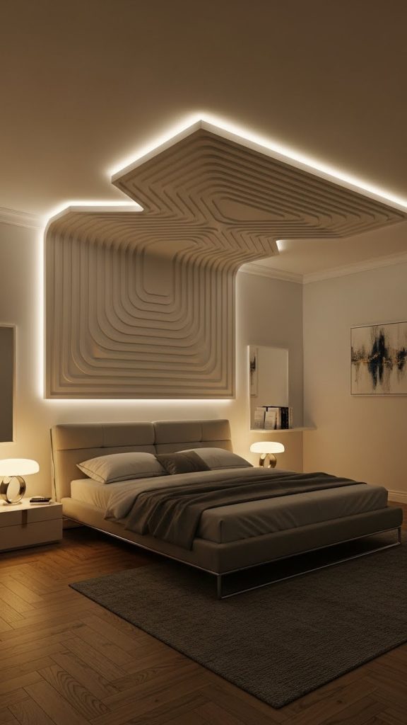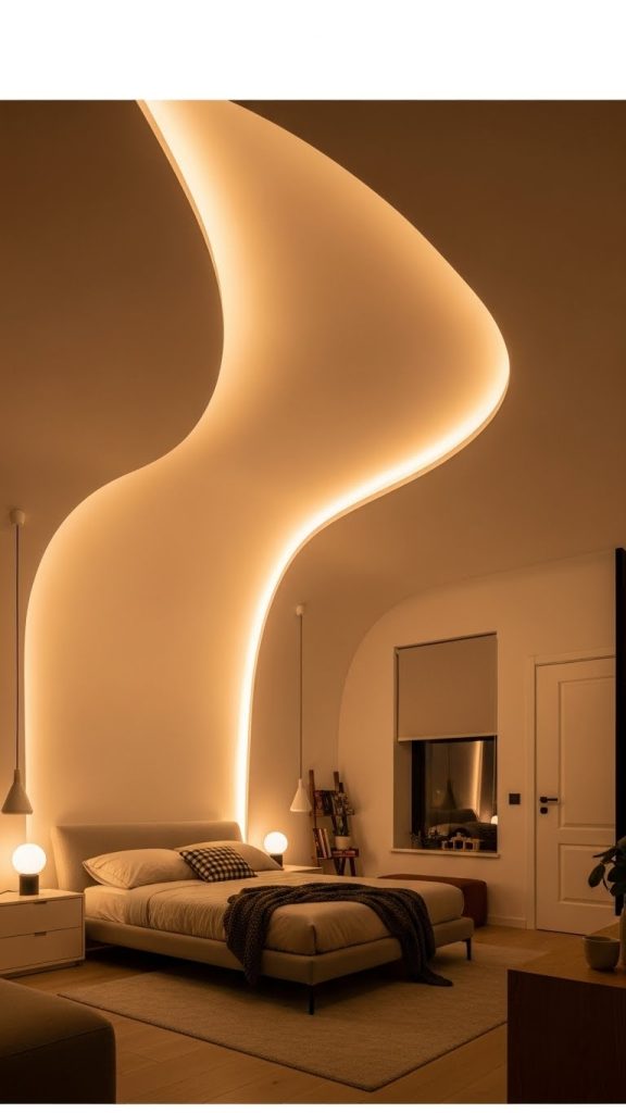 Curved false ceilings bring fluidity and softness to a bedroom design. Unlike straight-edged ceilings, curved designs use smooth, flowing lines, often created with POP or gypsum materials. This style is particularly suitable for modern, contemporary, and luxury bedroom interiors. Curved ceilings allow for creative lighting solutions, such as hidden LED strips or spotlights along the curves, enhancing the visual effect. These ceilings can also be combined with wooden panels or textured finishes for added elegance. Preparation involves careful planning of the curves and supporting framework, as precision is crucial for achieving smooth lines. Curved ceilings create a relaxing and visually dynamic environment, making the bedroom feel unique and stylish. They work best with minimalist furniture, soft neutral tones, and subtle decorative elements, ensuring that the ceiling remains the roomโ€™s focal point without overwhelming the space.