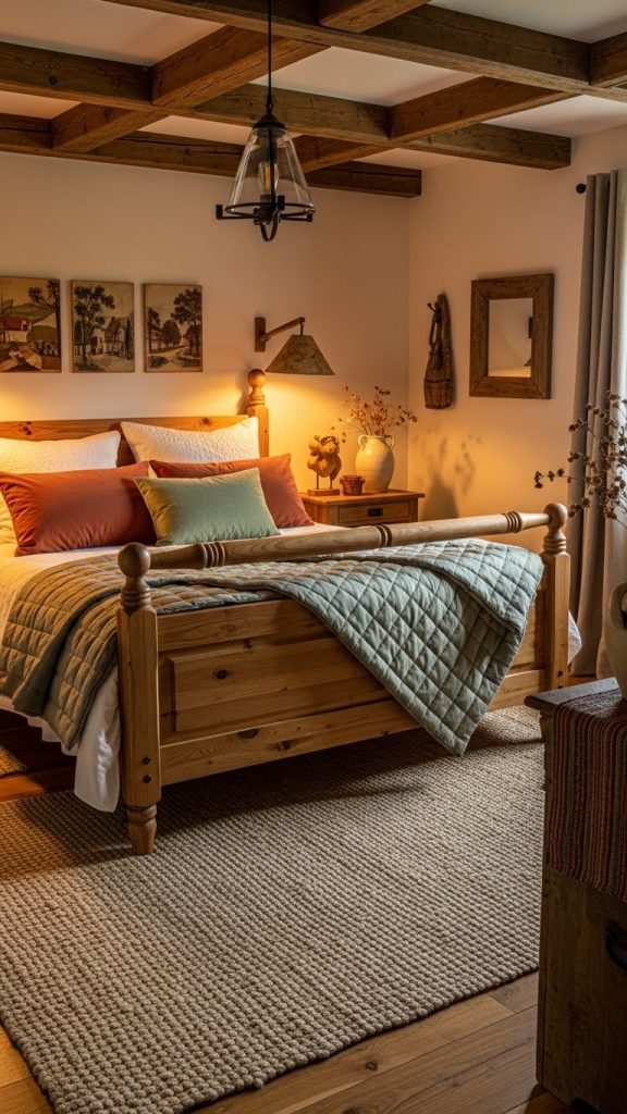 Add comfort with quilts, plush cushions, and textured rugs. A small reading corner with a comfortable chair and side table adds functionality. Lighting can include warm-toned bulbs and rustic lamps with wood or metal finishes. Consider decorative accents like vintage wall art or handcrafted decor to enhance authenticity.