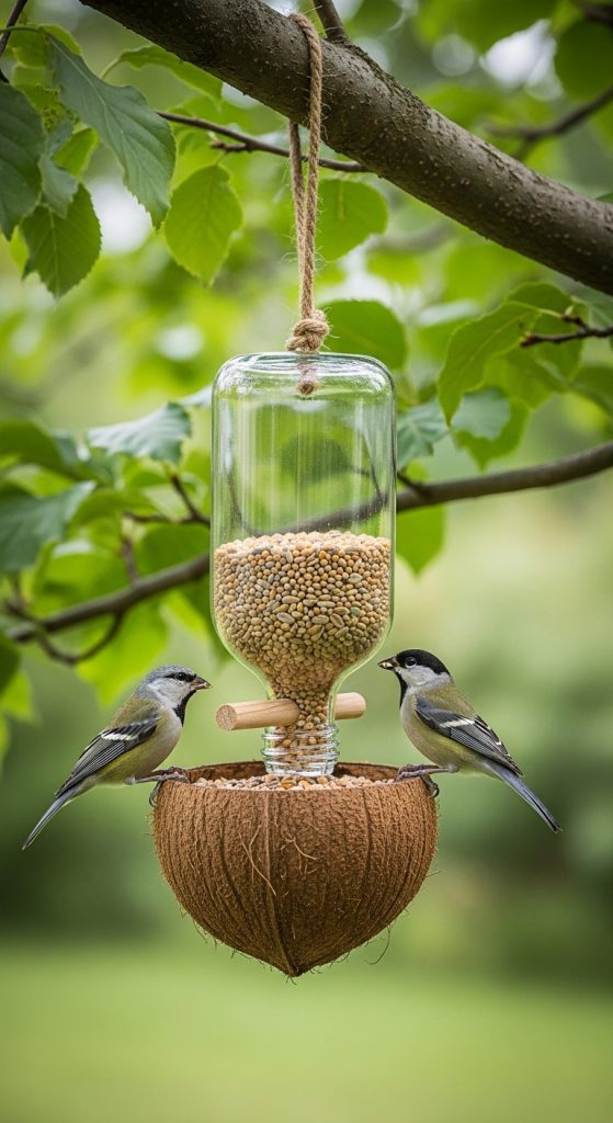 Combining glass bottles with natural materials like coconut adds an eco-friendly touch. Materials needed include a glass bottle, a halved coconut shell, rope, drill, wooden perch, and birdseed. Clean the bottle and coconut shell thoroughly.