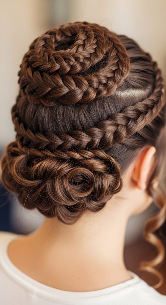 Styling tips: Create two or more braids depending on your hair length. Wrap the braids around the back or crown of your head and secure with bobby pins. Pull out a few curly strands around the face for a soft, romantic effect. Braided updos are perfect for weddings, parties, and professional events, providing an elegant and polished appearance.