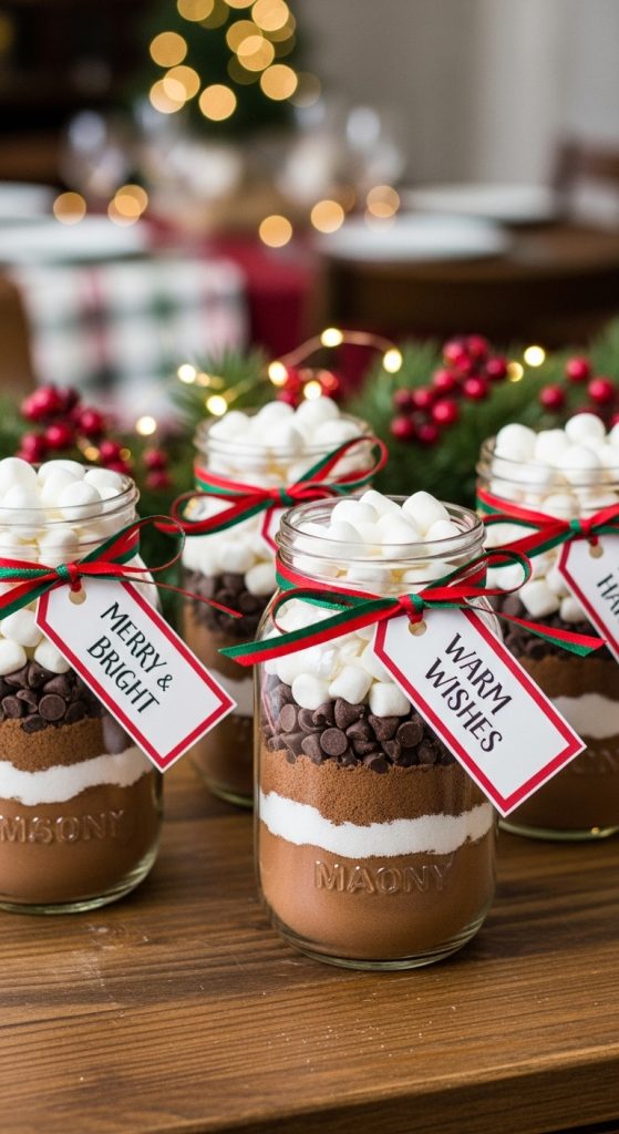A cozy cup of hot chocolate is a classic symbol of winter comfort, making a custom hot cocoa jar a perfect DIY gift. To prepare, gather mason jars, cocoa powder, sugar, powdered milk, chocolate chips, and mini marshmallows. Layer each ingredient in the jar for a beautiful visual effect, starting with cocoa powder at the bottom, followed by sugar, powdered milk, and toppings. Seal the jar tightly and decorate it with festive ribbons and a handwritten tag that includes preparation instructions such as “Add three tablespoons of mix to one cup of hot milk.” You can also experiment by adding crushed peppermint or cinnamon powder for a holiday twist. These jars are simple to make in bulk, making them perfect for gifting teachers, neighbors, or coworkers. The visual layers combined with the delicious flavor make this an irresistible and heartfelt Christmas present.