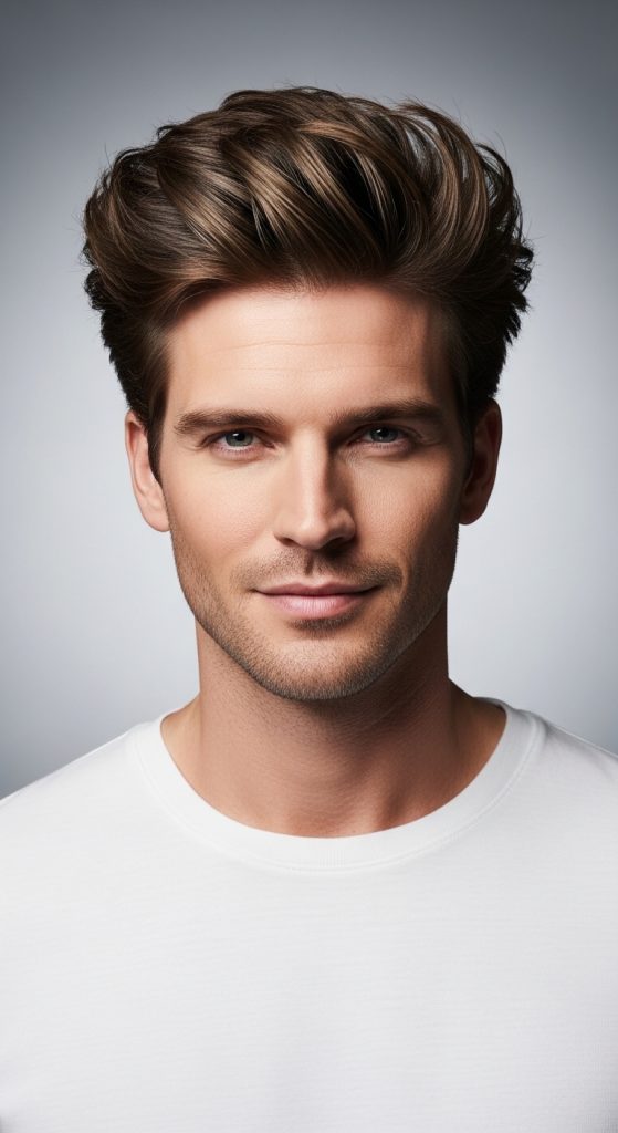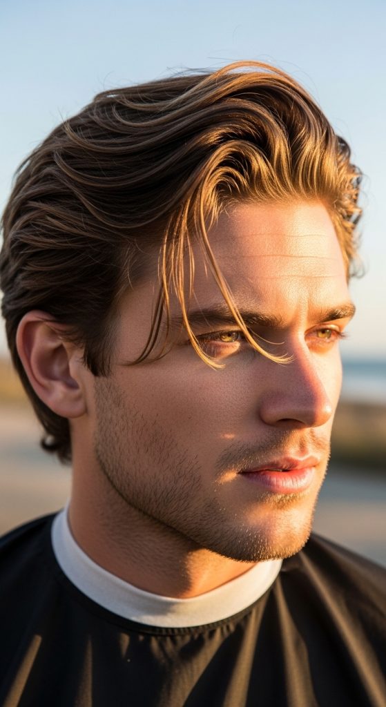 The classic medium layered cut is one of the most balanced haircut ideas for men because it enhances natural hair movement while maintaining a clean structure. This style works by cutting the hair into gradual layers that create dimension and reduce bulk. It is suitable for straight, wavy, and slightly curly hair types. The layering technique helps the hair fall naturally, giving it a soft and controlled appearance without looking overly styled. In Pinterest ideas for modern grooming, this haircut is often seen as a foundation style because it adapts easily to different fashion choices and face shapes. It also works well for individuals who prefer low-maintenance looks that still appear intentional and well-groomed. The layered structure allows the hair to shift naturally throughout the day, making it a practical option for both work and casual environments. This makes it a strong example of a beginner friendly and easy project haircut concept.