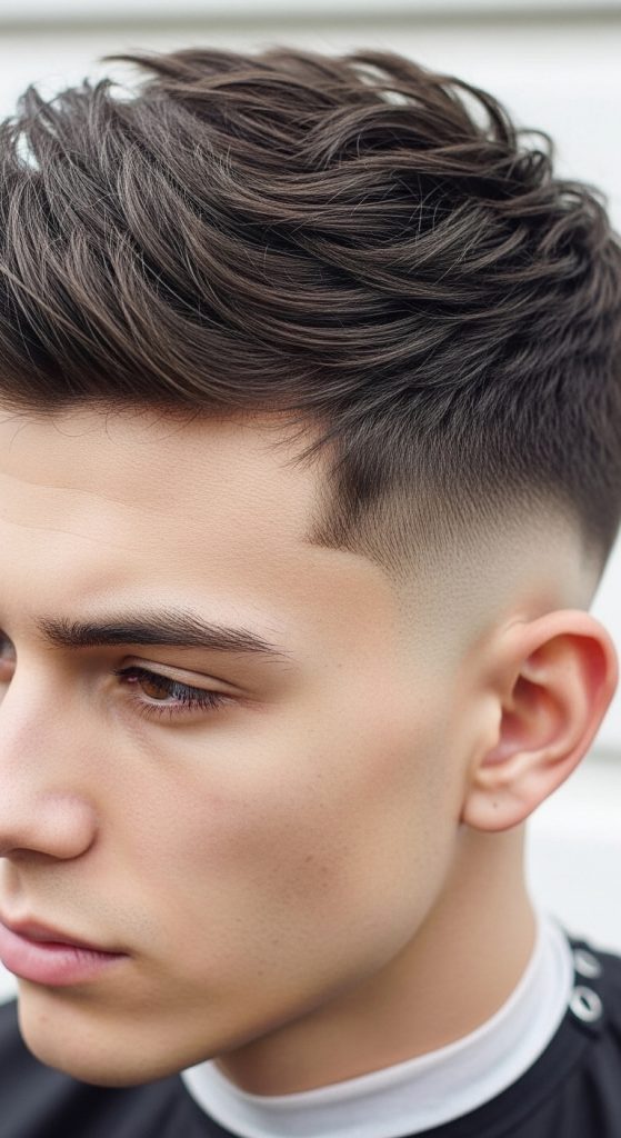 To create this style, the hair should first be washed and left slightly damp for easier handling. The top section is trimmed in a way that maintains length while introducing uneven texture through controlled cutting techniques. The sides are kept shorter but not overly faded, ensuring a balanced transition. Once the cut is complete, the hair is dried using a natural air-dry method or light blow-drying to enhance texture. The final shape should feel relaxed rather than structured. Small adjustments can be made by lifting sections of hair and trimming selectively to improve movement. The finishing result should emphasize natural flow rather than sharp lines. This haircut is a strong example of a creative project that fits modern design preferences while remaining beginner friendly and practical for everyday use.