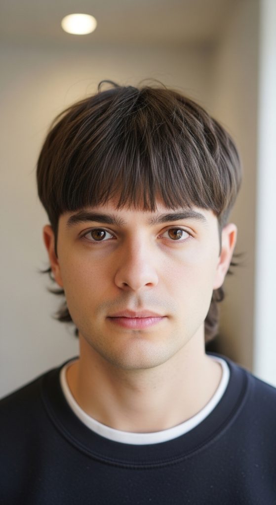 To create this style, the hair is first divided into front and back sections. The fringe area is carefully trimmed to achieve the desired length while maintaining natural texture. The sides and back are adjusted to complement the front without overpowering it. After cutting, the hair is styled forward to establish the fringe direction. Light layering may be added to prevent heaviness and improve movement. The final shape should feel soft and natural rather than rigid. Regular trimming helps maintain the fringe length and prevents uneven growth. This haircut is ideal for DIY tutorials and beginner friendly grooming because it requires minimal styling tools while still delivering a strong visual impact. It fits well within modern design and easy project hairstyle concepts.