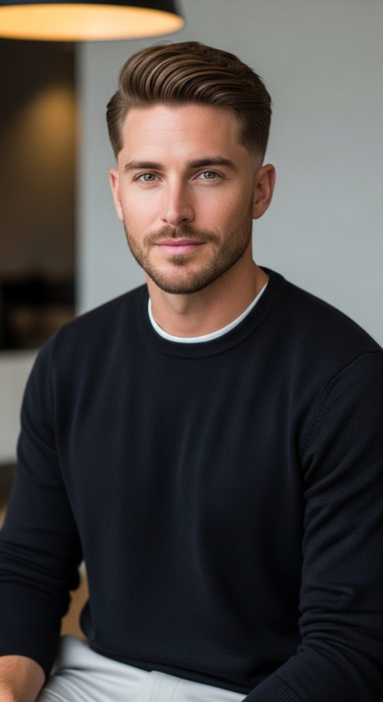 The medium textured crop is a modern haircut idea that focuses on controlled messiness and natural volume. It is designed to create a slightly rugged yet clean appearance, making it popular in contemporary grooming inspiration. The hair is kept at a medium length on top while the sides are slightly tapered to maintain shape. The key feature of this style is texture, which gives the hair a dynamic and effortless look. It works especially well for thick or wavy hair because it enhances natural movement. In Pinterest ideas and trending styles, this cut is often associated with minimalist style because it does not require heavy styling to look complete. Instead, it relies on the natural direction of the hair combined with subtle shaping. This makes it suitable for individuals who prefer low maintenance grooming with a modern aesthetic outcome.