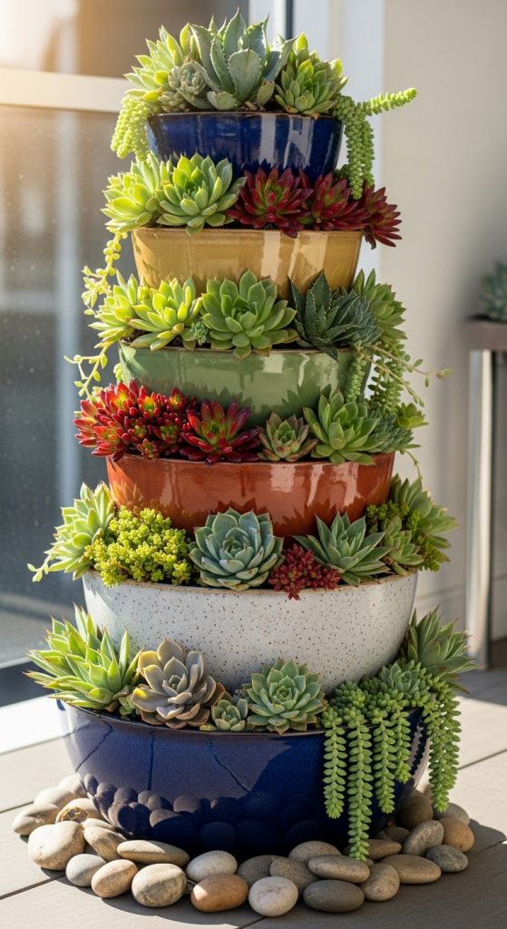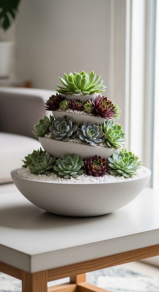 Tiered succulent gardens are ideal for patios, entryways, or balcony corners. They create a striking focal point while accommodating more plants in limited space. Ensure all containers have proper drainage to prevent root rot. The vertical structure enhances sunlight exposure for all plants and offers a visually balanced design suitable for any modern home.