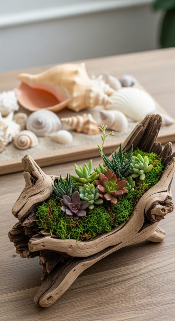 A driftwood succulent arrangement combines organic textures with plant life, offering a natural, coastal-inspired look. You will need a piece of driftwood with natural crevices, moss, succulent soil, and small succulents.