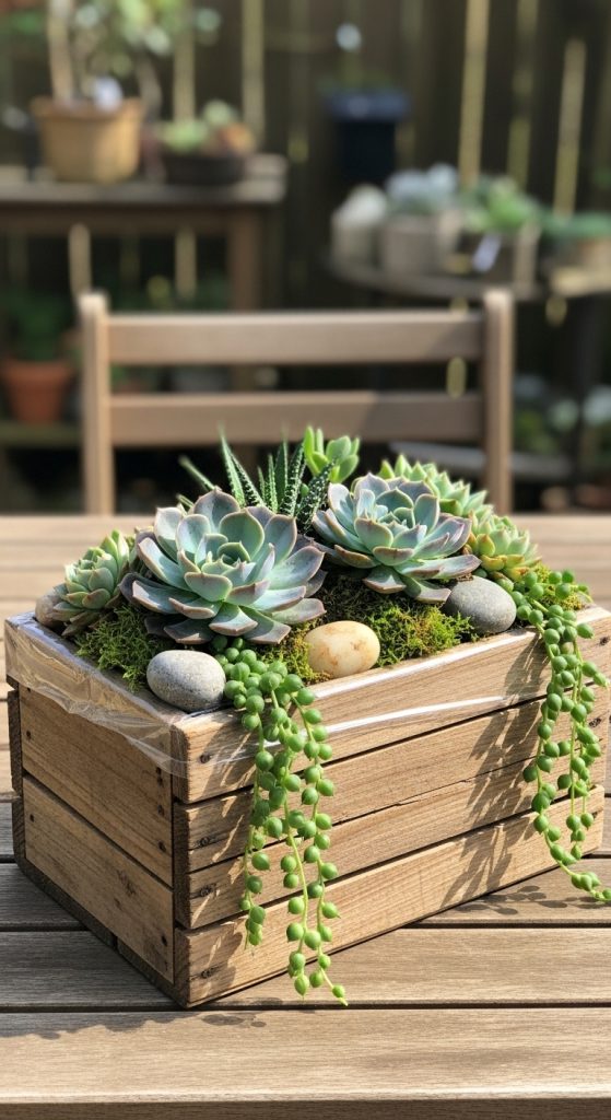 Wooden box succulent gardens work well as table centerpieces or balcony decor. They thrive in bright sunlight and require watering every two to three weeks. Over time, the plants will grow and fill the box, creating a lush, miniature landscape. You can also use old drawers or wooden wine crates for a vintage look.