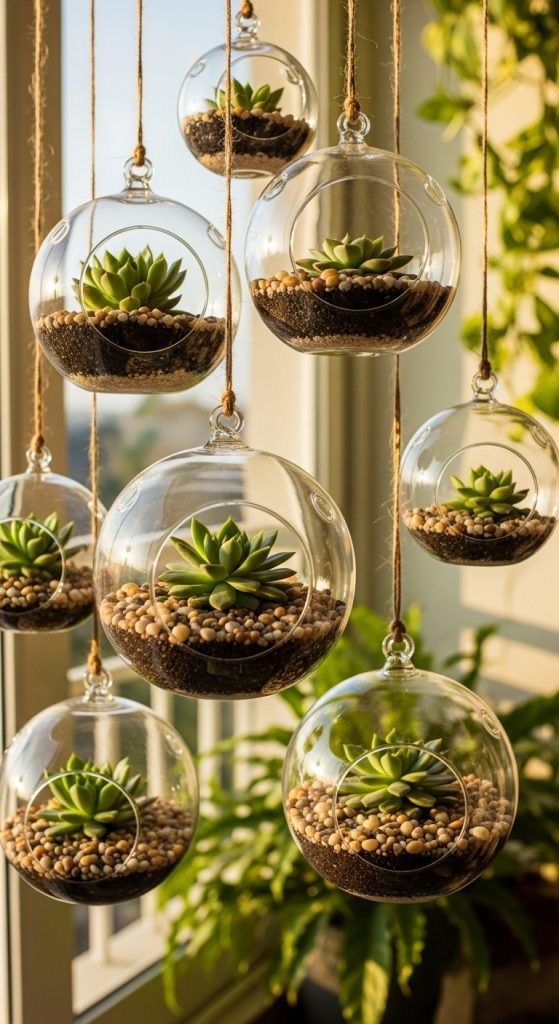 These hanging gardens are lightweight, space-saving, and easy to maintain. Water sparingly with a spray bottle, ensuring excess moisture drains out. Hanging succulent globes bring a modern, airy touch to interiors and make excellent gift options for plant enthusiasts. They also work well in clusters of varying heights for a dynamic visual effect.
