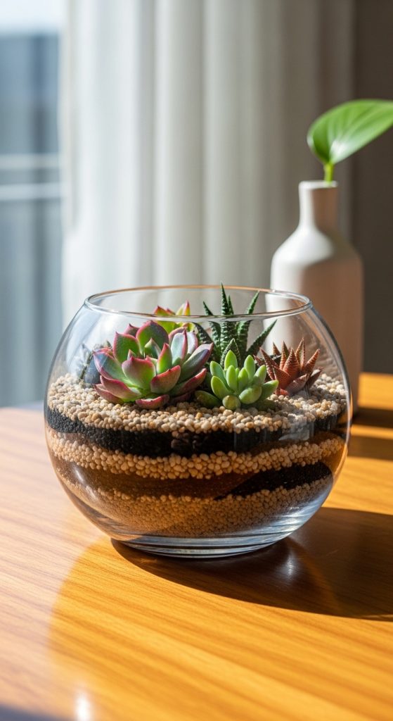 A tabletop terrarium is one of the most elegant ways to create a mini succulent garden. Start with a clear glass bowl, vase, or jar to provide visibility of the layered soil and decorative stones. You will need small succulents, cactus soil mix, activated charcoal, pebbles, and decorative sand.