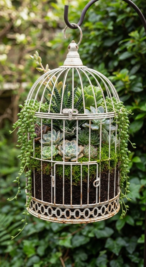 Repurposing an old birdcage into a succulent planter brings vintage charm and creativity to your garden decor. Materials include a metal or wire birdcage, coconut liner, succulent soil, moss, and assorted succulents.