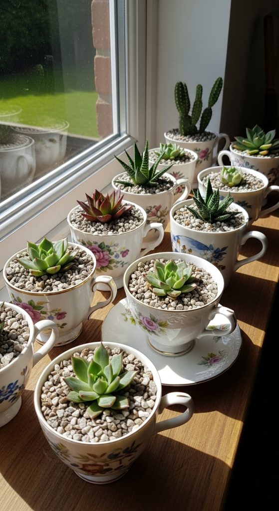 Repurposing old teacups or mugs into succulent planters is an excellent way to create a personalized mini garden. These small containers work perfectly for single succulents or small clusters. Materials required include a teacup, succulent soil, pebbles, and a small succulent plant.