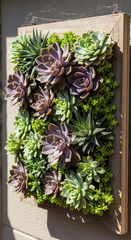 A vertical frame garden is an innovative way to display succulents, especially in small spaces. Materials include a shadow box or picture frame, chicken wire, sphagnum moss, and a selection of small succulents.