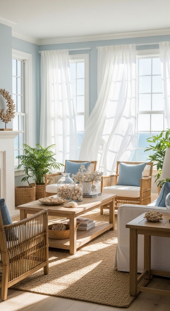 Coastal interior design is inspired by the beach, ocean, and seaside living. It emphasizes light, airy spaces, soft color palettes, and natural materials. Colors often include shades of blue, white, beige, and sandy tones, reflecting the sea and shore. Furniture is casual, comfortable, and often made of light woods or wicker. Natural fibers such as cotton, linen, and jute are commonly used in rugs, curtains, and upholstery. Dรฉcor often includes seashells, driftwood, nautical elements, and beach-inspired artwork. To prepare a home for a coastal makeover, focus on maximizing natural light and creating an open, breezy atmosphere. Use soft, flowing fabrics for curtains and cushions to enhance the relaxed vibe. Furniture should be comfortable yet functional, encouraging leisure and social gatherings. Layering textures like rugs, throws, and pillows adds depth and interest. Coastal design also emphasizes a connection with nature, including indoor plants or elements reminiscent of the sea. This style suits those seeking a tranquil, fresh, and relaxed living environment. It evokes the feeling of a permanent vacation by the sea, creating a cheerful and welcoming home.