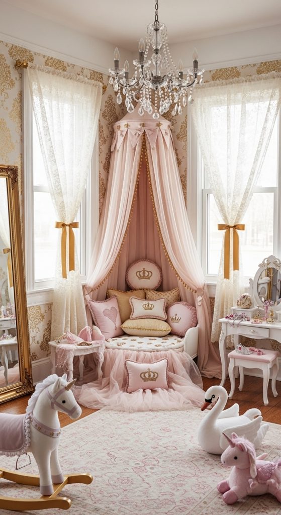 Before decorating, prepare the room by painting the walls in a soft blush or cream base. Choose furniture with curved edges and elegant designs. Incorporate a chandelier or crystal-like ceiling light to enhance the royal atmosphere. Velvet cushions, satin bedding, and lace curtains create an opulent yet comfortable space. Use toy storage disguised as treasure chests or ornate boxes. A small vanity mirror and dress-up corner encourage imaginative play. This room design nurtures a child’s creativity and gives them a magical space to dream and grow.