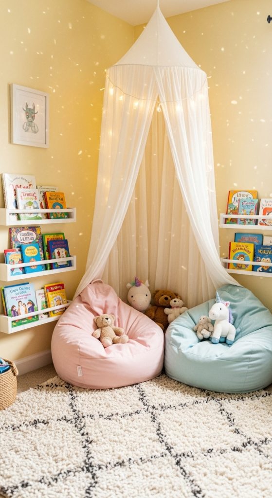 Preparation includes ensuring furniture edges are smooth and all materials are non-toxic. Use soft, washable rugs and beanbags for comfort. Add a canopy or tent to define the reading zone, giving it a magical hideaway feel. Warm string lights or a small lamp make reading time inviting. Choose furniture in neutral tones, allowing colorful books to serve as decoration. You can also add alphabet prints or framed quotes about reading. This design fosters a love of books and helps develop focus and imagination in a safe, nurturing environment.