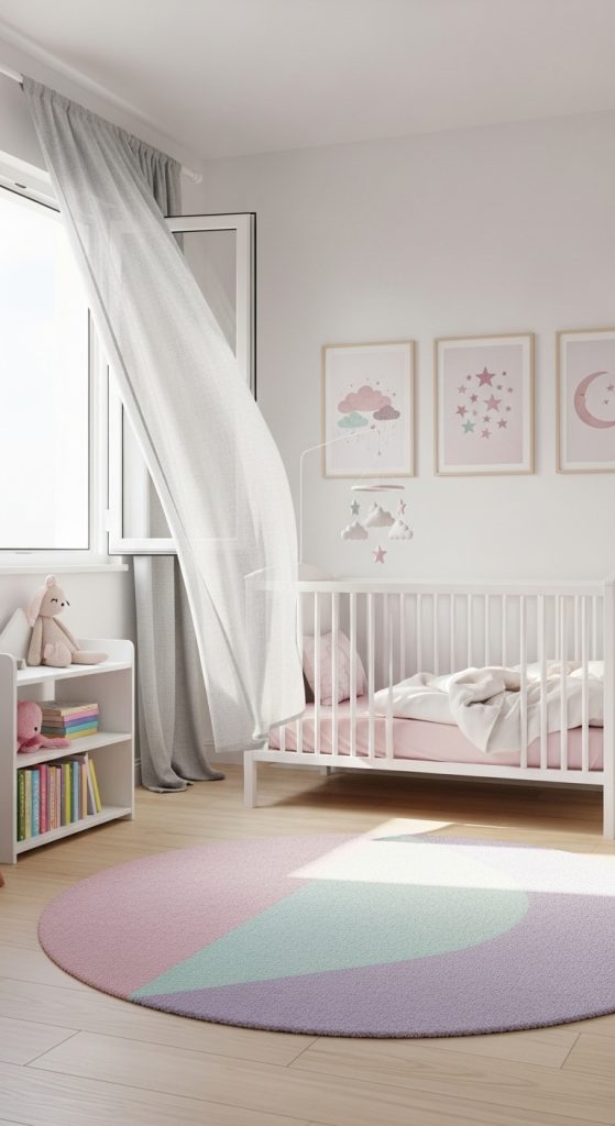 Preparation includes painting the walls with low-VOC paints that are safe for children. Choose durable furniture with rounded edges for safety. Add decorative touches like a white canopy above the bed or pastel-colored storage bins for toys. Natural light should be maximized with light, airy curtains. Textiles like cotton or linen offer comfort while being easy to clean. Accent with framed prints, soft pillows, and fairy lights to add charm. This setup creates a tranquil, dreamy room where a toddler can rest, read, and play comfortably.