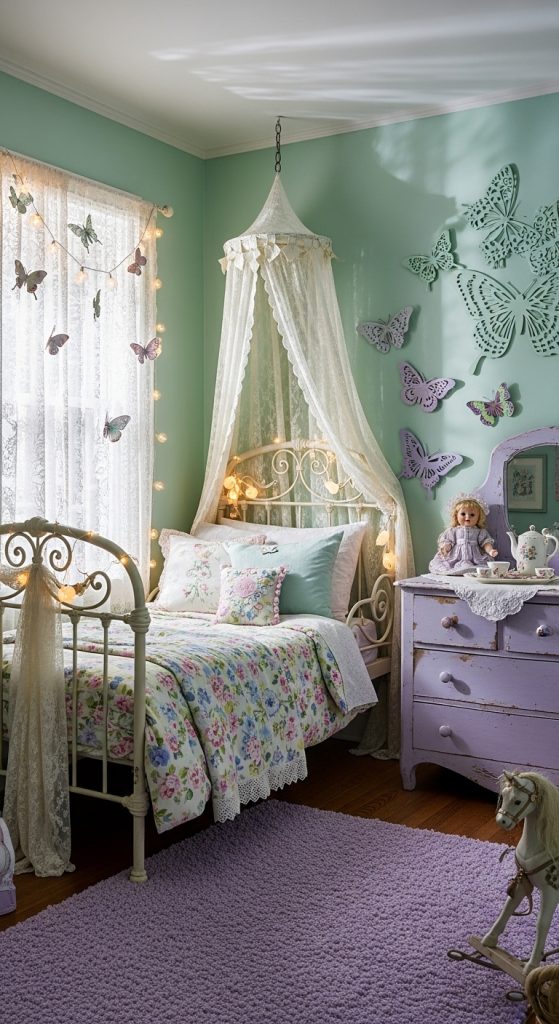 A vintage fairy garden theme combines the charm of old-world decor with the whimsy of childhood imagination. Think soft colors, antique-style furniture, and fairy-inspired details. Begin with a light pastel wall color—lavender, dusty rose, or mint green—and add vintage-style wallpaper on one accent wall for texture.
