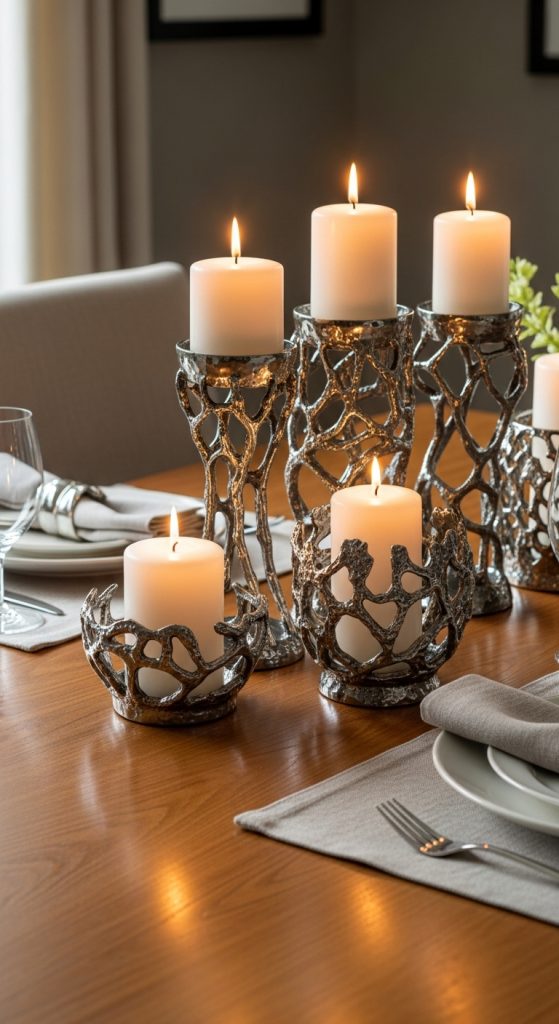 Michael Aramโs candleholders, often shaped like branches, leaves, or abstract forms, are essential for creating mood and intimacy at the dining table. Preparation involves selecting the right size and number of candleholders for your table dimensions. Consider grouping them in odd numbers to achieve a visually appealing composition. Pair metallic candleholders with neutral or earth-toned candles to maintain a natural, elegant look. Position them strategically to avoid obstructing sightlines or creating uneven lighting. These candleholders can also be mixed with floral or leafy centerpieces to reinforce the nature-inspired theme. When lit, the reflective surfaces of the metal amplify the candlelight, adding warmth and a soft glow that enhances the dining experience. Incorporating these pieces balances artistic design with functionality, creating a cozy, inviting environment that aligns with Michael Aramโs signature style.