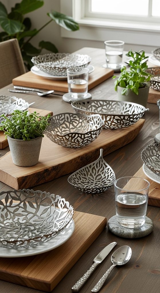 Pairing Michael Aram pieces with natural elements reinforces the organic elegance of your dining decor. Materials like wood, stone, and fresh greenery complement metal sculptures and trays, creating a harmonious and textured tabletop. Preparation involves selecting complementary items, such as wooden chargers, stone coasters, or small potted plants. Strategically place these elements around metallic centerpieces or serveware to create a balanced visual composition. Natural elements also provide contrast in color and texture, highlighting the intricate details of Michael Aram designs. For instance, a leaf-patterned bowl placed atop a wooden board creates a tactile and aesthetic layering effect. Incorporating these elements ensures that your dining table feels connected to the natural world while maintaining sophistication. This approach captures the essence of Michael Aramโs philosophy, blending art, nature, and functionality into a cohesive, elevated dining experience.