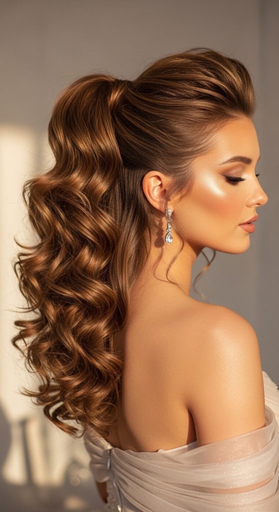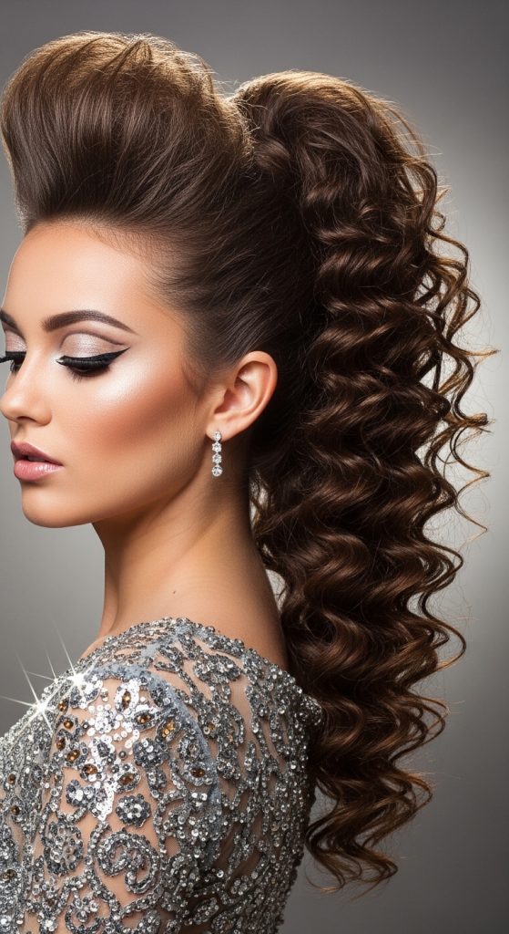 To create this hairstyle, begin by curling the hair in sections. Tease the crown area gently to create volume. Gather the hair into a high ponytail and secure it tightly. Allow curls to fall naturally while adjusting for even distribution. Use pins if needed to maintain crown height. Finish with flexible hold spray to preserve volume and shape. This method ensures a long lasting prom hairstyle with a dramatic yet controlled finish.