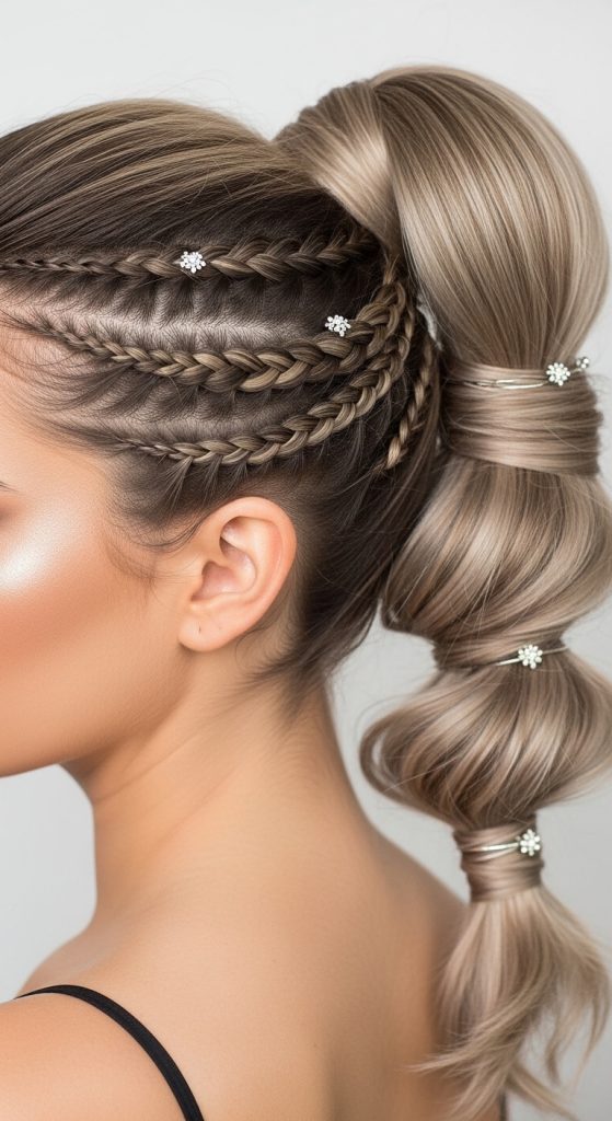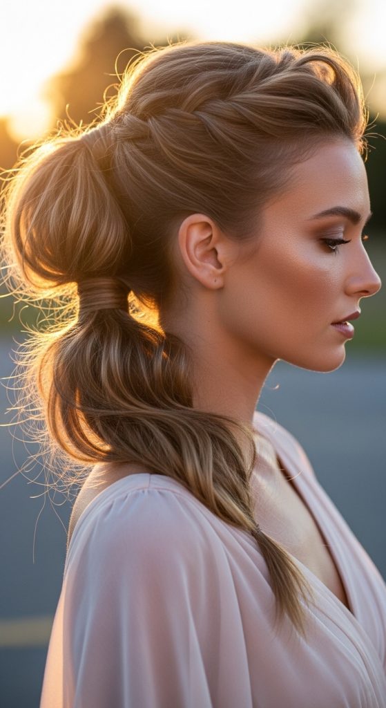 This style blends half-up braiding with a ponytail structure. It is designed for layered visual interest and works well for medium to long hair. The braid adds detail while the ponytail maintains structure.
