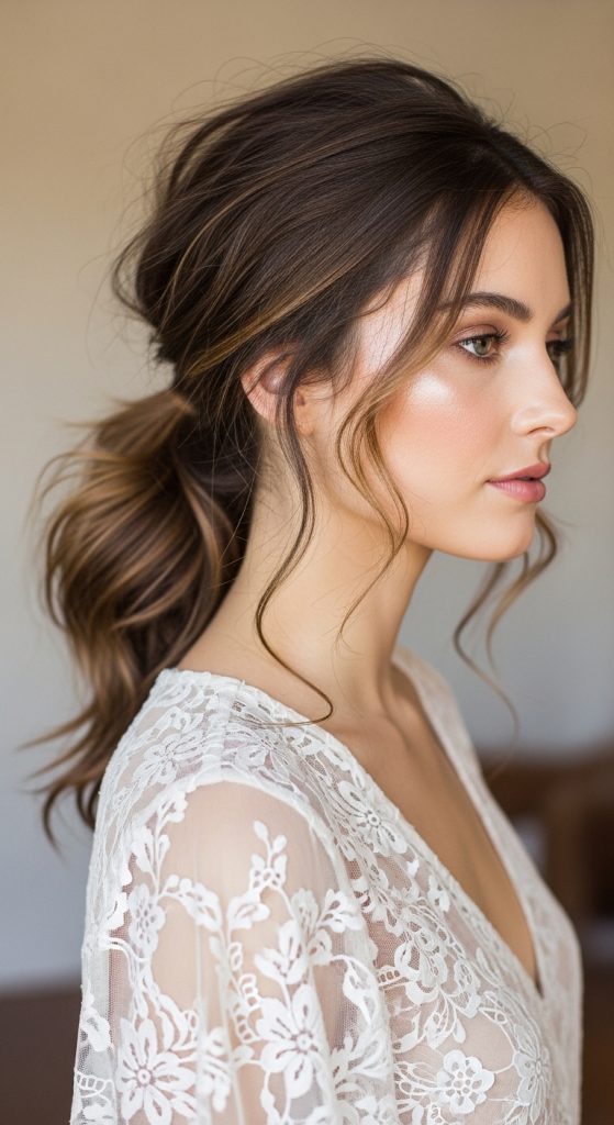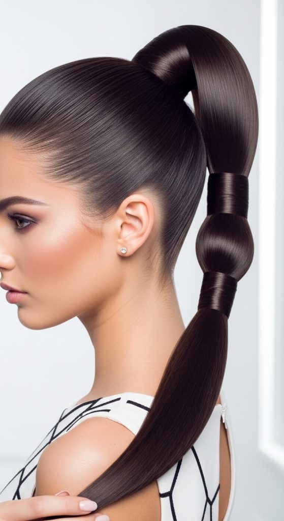 The braided accent ponytail introduces texture and detail into a traditional ponytail by incorporating small or medium braids along the crown or sides. This style is especially popular in Pinterest ideas because it adds visual interest without overwhelming the overall look. The braid acts as a decorative element that enhances the structure of the ponytail while maintaining elegance. It is suitable for individuals who want a creative project that still feels formal and balanced. The braid can be placed along one side, wrapped around the base, or integrated into the ponytail itself. This hairstyle works well with both straight and wavy textures and allows flexibility in design. It also complements minimalist dresses by adding subtle complexity to the overall appearance.