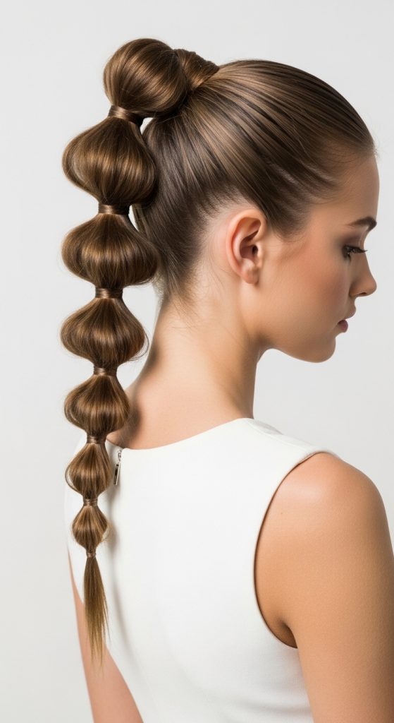 To create this hairstyle, begin by securing the hair into a high or mid ponytail using an elastic band. Add additional elastic bands at equal intervals down the length of the ponytail. Gently pull each section outward to form rounded bubble shapes. Adjust the volume of each section for symmetry and balance. Light teasing can be used to enhance fullness. Finish with a light hold spray to maintain structure. This step by step method creates a visually striking prom hairstyle that remains stable and fashionable throughout the event.