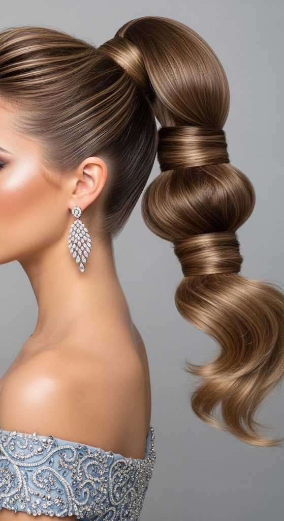 To create this hairstyle, start by brushing the hair thoroughly to remove all tangles and knots. Apply a smoothing product to reduce frizz and help the hair stay flat against the scalp. Next, gather the hair at the crown of the head, ensuring it is positioned evenly on all sides. Secure it tightly using a strong elastic band to maintain height and structure. A small section of hair can be wrapped around the base of the ponytail to hide the elastic and create a more polished finish. Use a flat iron if necessary to refine the lengths and enhance smoothness. Finish with a light layer of holding spray to keep the style intact throughout the event. This step by step tutorial approach ensures that the hairstyle remains secure and visually clean while maintaining its elegant prom-ready appearance.