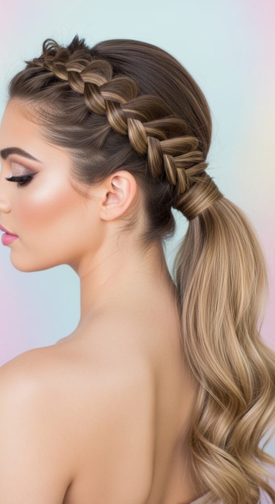 To create this style, braid the upper section and combine it with a ponytail. Secure and adjust volume. This step by step process results in a balanced prom hairstyle.