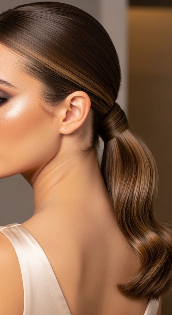A sleek high glam ponytail is a classic prom hairstyle that focuses on smoothness, elevation, and clean structure. This style is designed to create a lifted facial appearance while maintaining a polished and modern aesthetic. It is especially suitable for formal dresses that highlight the neckline and shoulders. The hair is styled tightly at the crown to create a high-positioned ponytail that emphasizes symmetry and shine. The overall effect is elegant and refined, making it a popular choice in Pinterest ideas for prom inspiration. The sleek finish gives the hairstyle a professional appearance even when created as a DIY project. This look works best on straight or lightly textured hair, but it can also be adapted for wavy hair with proper smoothing techniques. The key focus is controlling flyaways and achieving a glossy surface that reflects light naturally. The style represents a balance between simplicity and sophistication, making it ideal for individuals seeking a minimalist yet impactful prom hairstyle.