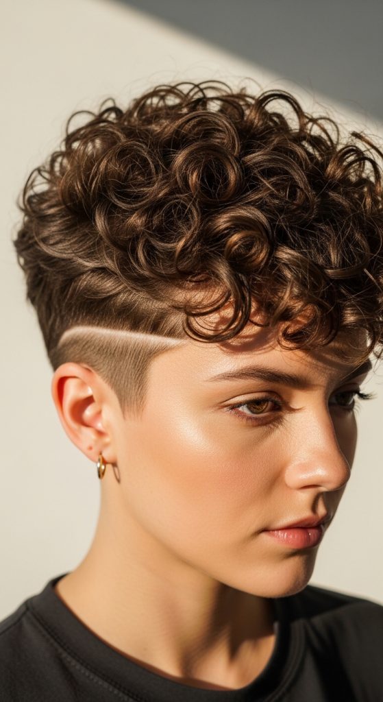 Styling involves defining curls using lightweight products that support shape without heaviness. The shaved section is kept clean and maintained regularly. This style is ideal for easy project inspiration and works well for individuals seeking both texture and modern design in one haircut.
