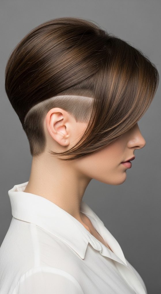 Styling involves lifting the crown area using lightweight products that enhance texture without stiffness. The shaved undercut remains exposed, creating contrast that defines the overall shape. This haircut is particularly effective for those seeking creative project inspiration in short hair transformations. It supports both minimalist style and bold fashion expression, making it a versatile choice for modern design-focused looks.