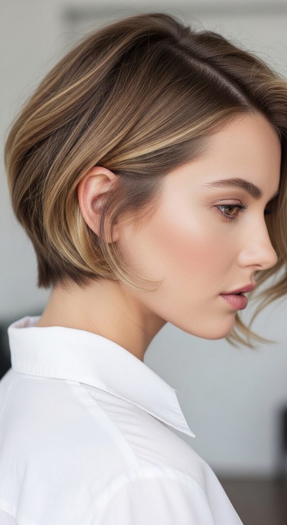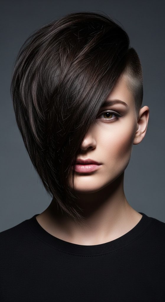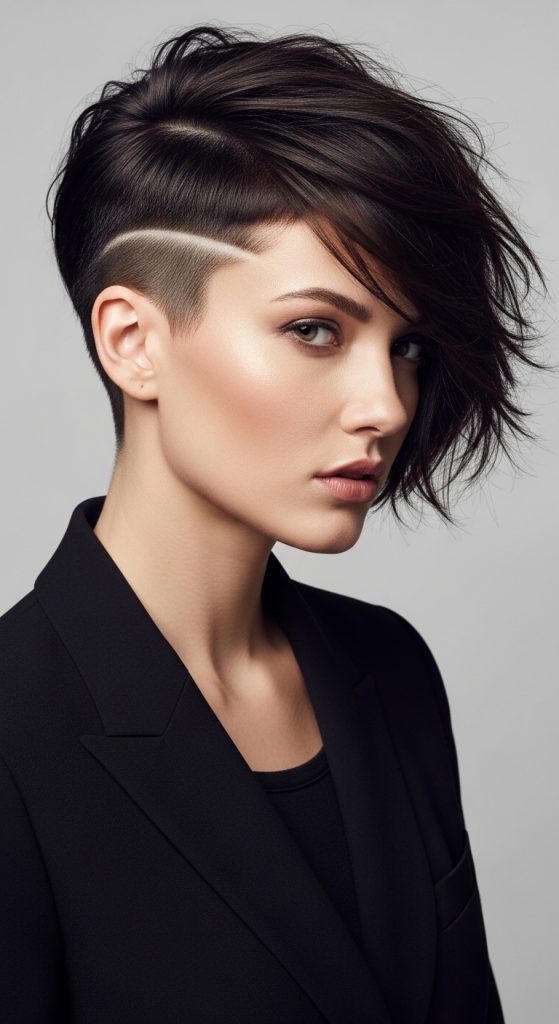 Styling focuses on direction, with hair often swept toward the longer side to enhance contrast. This look fits well within creative project inspiration for short hairstyles and is commonly used in modern aesthetic transformations. It offers flexibility while maintaining a strong visual identity.