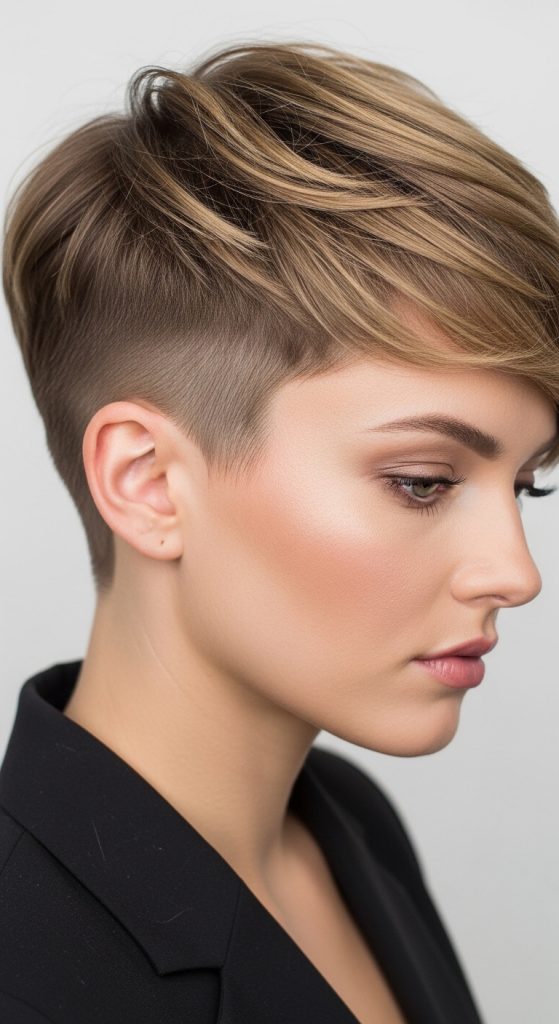 After cutting, styling begins by lifting the roots of the top section using a round brush or finger-drying technique. A lightweight product is applied to enhance separation and definition. The shaved area is kept clean and maintained regularly to preserve contrast. This style is highly adaptable for creative project inspiration because it can shift between sleek and tousled finishes depending on styling choices. It remains one of the most practical shaved pixie cut ideas for everyday wear and modern minimalist style lovers.