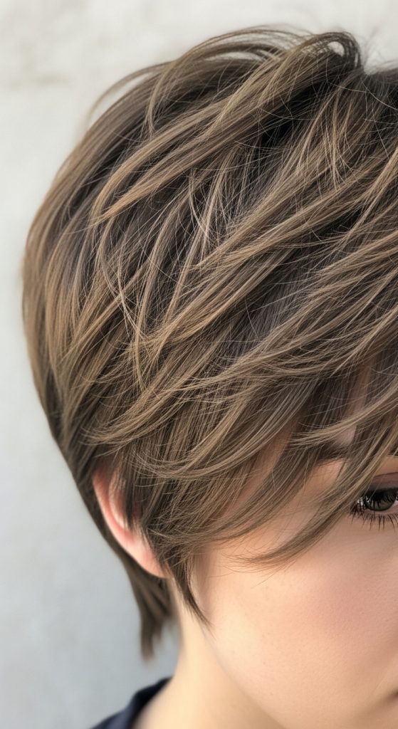 The textured layered pixie focuses on dimension and movement rather than strict uniformity. This hairstyle is defined by multiple layers cut at varying lengths, creating a naturally tousled appearance. It is especially popular in modern Pinterest ideas because it adds volume and softness without requiring complex styling routines. The layered structure allows hair to fall in different directions, producing a dynamic and effortless look. This style works well for individuals who prefer a slightly undone aesthetic that still feels intentional. It also suits fine hair types by adding the illusion of fullness through strategic layering techniques.