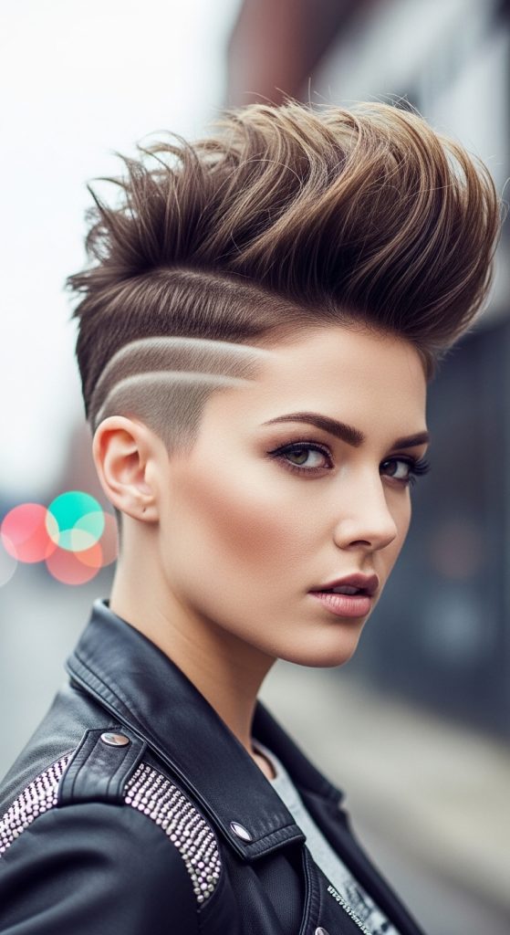The undercut pixie features shaved or closely cropped sides with longer top sections. This creates a strong contrast and bold silhouette.