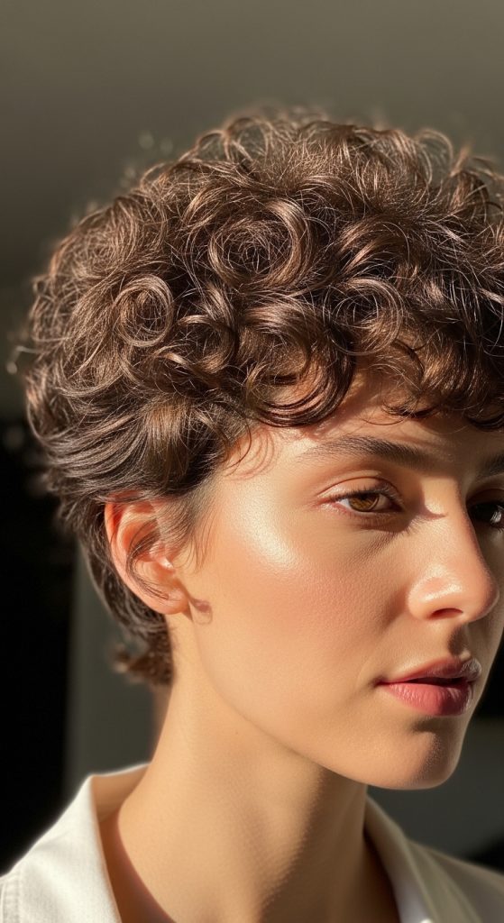 The curly pixie style embraces natural curl patterns while maintaining a structured short cut. It is designed to enhance volume and shape without restricting movement. This hairstyle is popular in Pinterest ideas focused on natural texture and easy maintenance. It works especially well for naturally curly or wavy hair types.