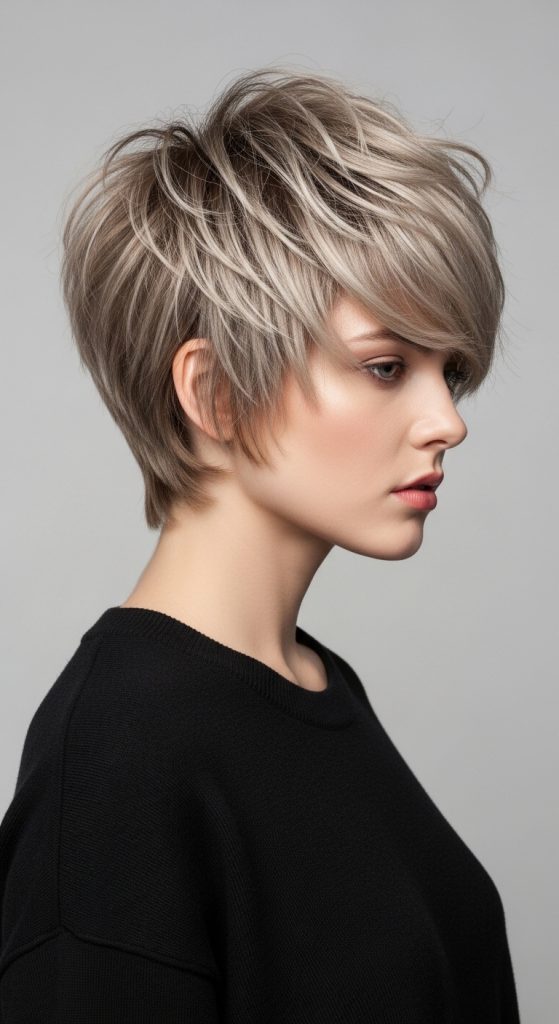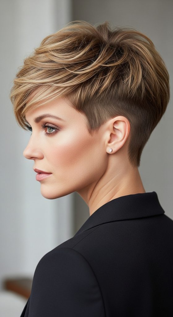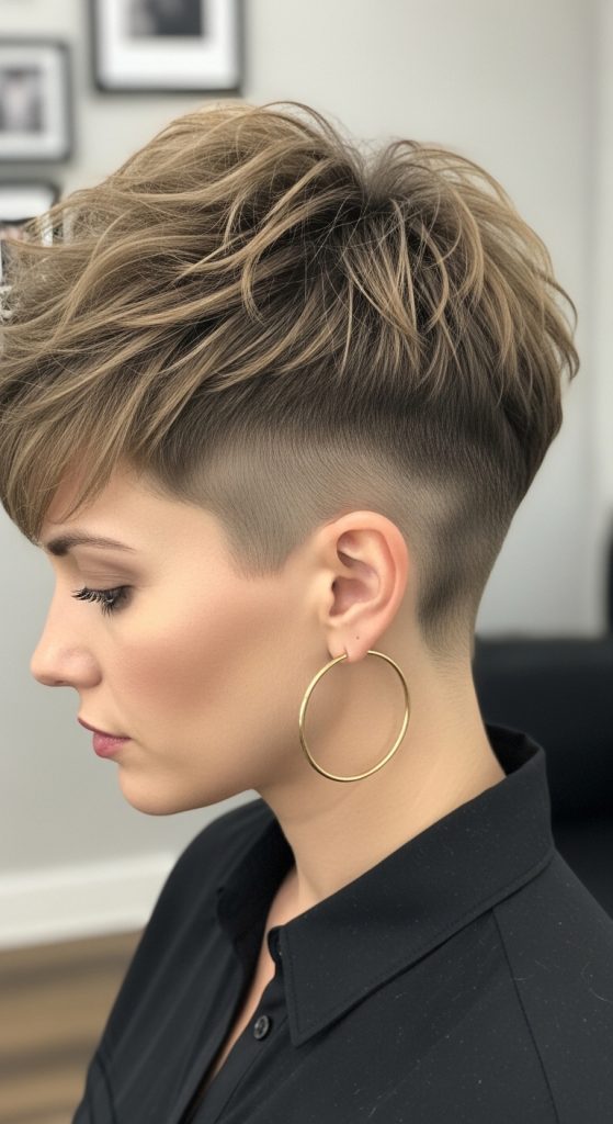 The undercut shaggy pixie adds bold contrast. The sides or back are clipped very short while the top remains layered and textured. This creates a dramatic yet balanced look.
