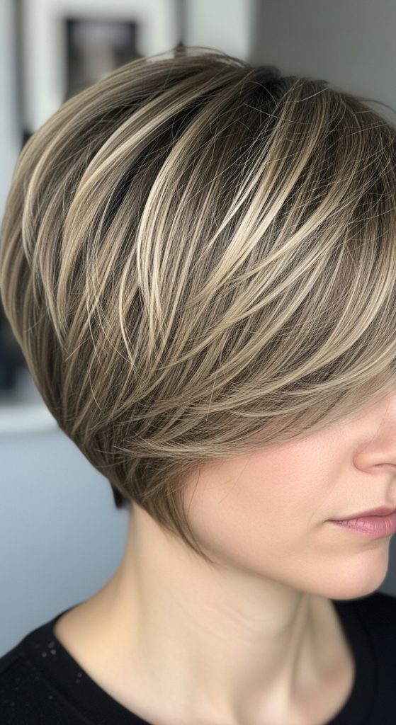 The tapered shaggy pixie gradually shortens toward the neckline. The back is closely shaped while the top stays textured and layered. This cut provides structure and elegance.