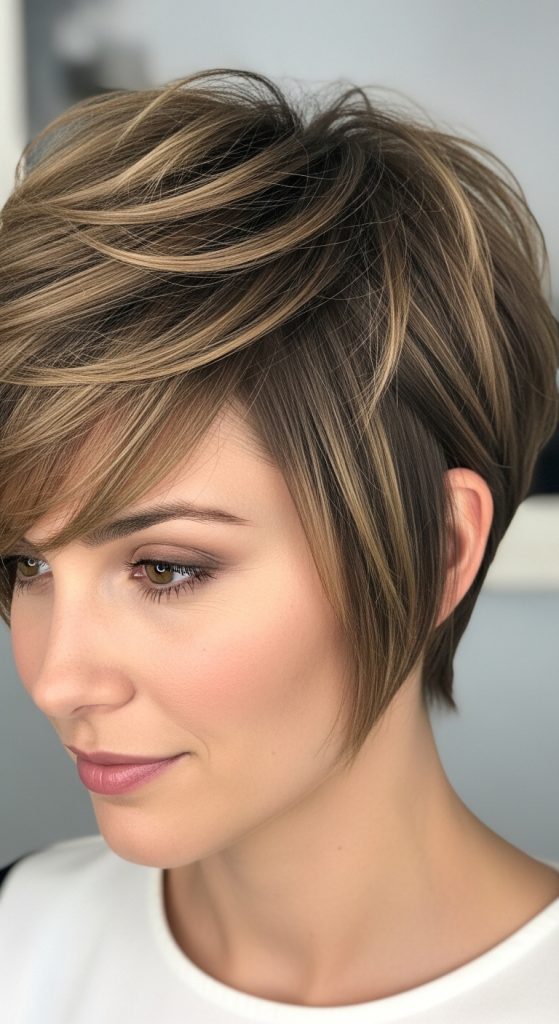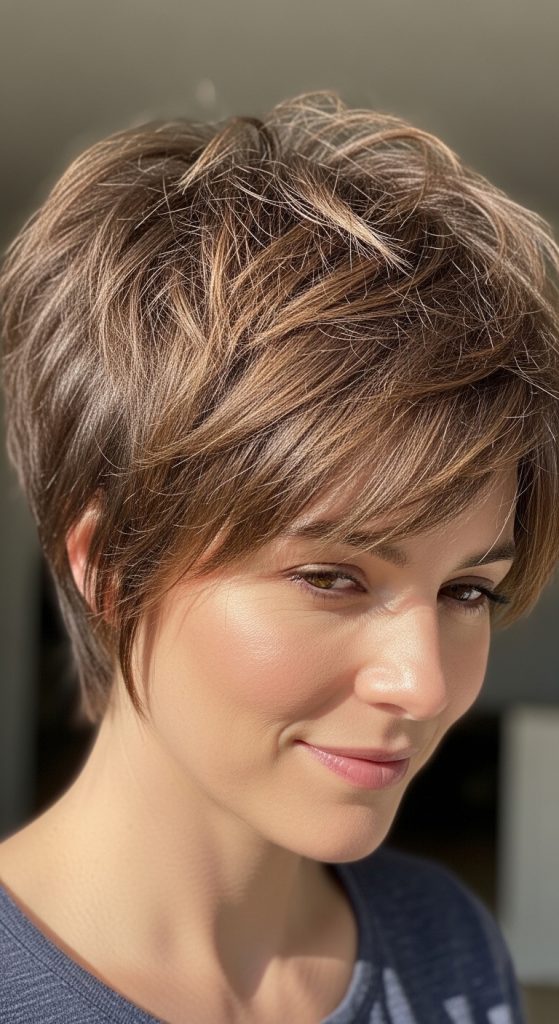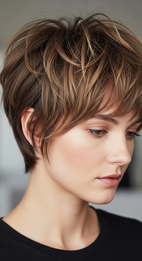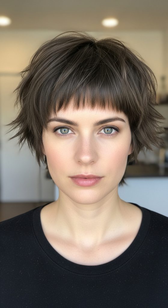 The choppy layered pixie with fringe adds extra personality through a textured bang area. The fringe can be slightly angled or softly straight across the forehead. This cut is ideal for women who want to frame their eyes and soften their features.