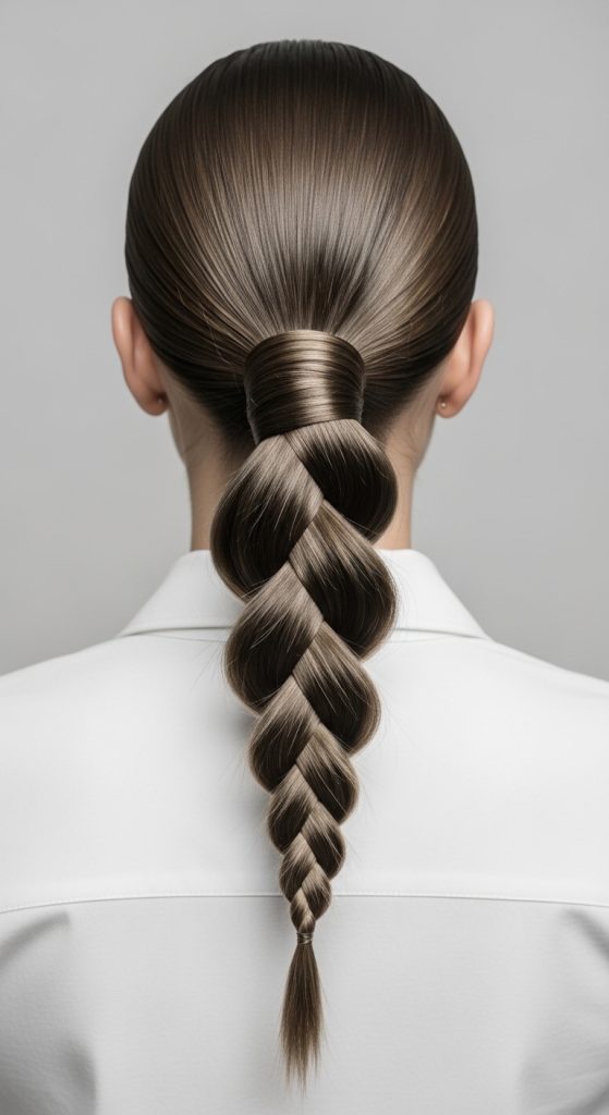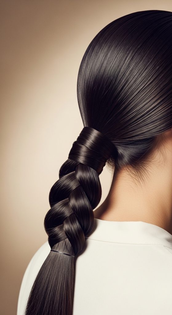 The wrapped base slick back braided ponytail introduces an elevated detail by concealing the hair tie with a section of wrapped hair. This variation is commonly seen in Pinterest ideas that focus on polished home decor-inspired aesthetics translated into personal styling. The wrapped base creates a seamless transition between the slick back foundation and the braid, enhancing the overall minimalist style effect. It is especially useful for formal or refined looks where visible hair ties may disrupt the clean design.