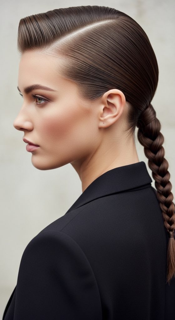 The sleek side part braided ponytail introduces asymmetry into the traditional slick back design. It is commonly featured in Pinterest ideas focused on modern design variations and subtle creative changes. The side part adds directional flow, giving the hairstyle a more dynamic and personalized appearance while still maintaining a controlled and polished structure.