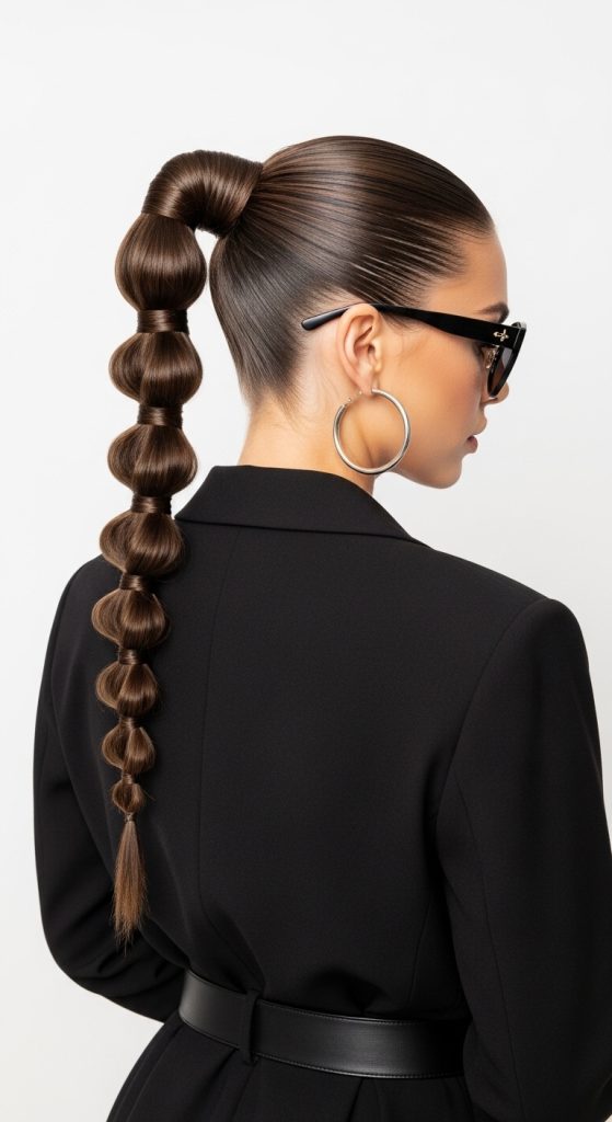 To create this hairstyle, begin by smoothing the hair backward into a high ponytail positioned at the crown of the head. Secure it tightly to maintain a clean base. Add additional hair ties along the length of the ponytail at equal intervals. Gently pull each section between the ties to create rounded โbubbles.โ This technique replaces traditional braiding with structured volume control. The result is a defined, segmented look that remains easy to create and highly adaptable for different hair types and lengths.