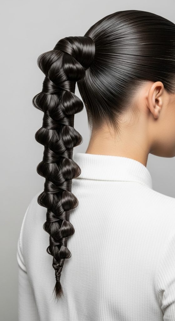 The high sleek ponytail bubble braid is a modern variation that adds volume and visual segmentation to the traditional slick back style. It is often featured in Pinterest ideas focused on creative project hairstyles because it transforms a simple ponytail into a structured, aesthetic design. The high placement of the ponytail elongates the face shape and creates a lifted appearance, while the bubble sections introduce a playful yet organized texture. This style is especially popular in minimalist and modern design trends because it balances simplicity with visual interest.