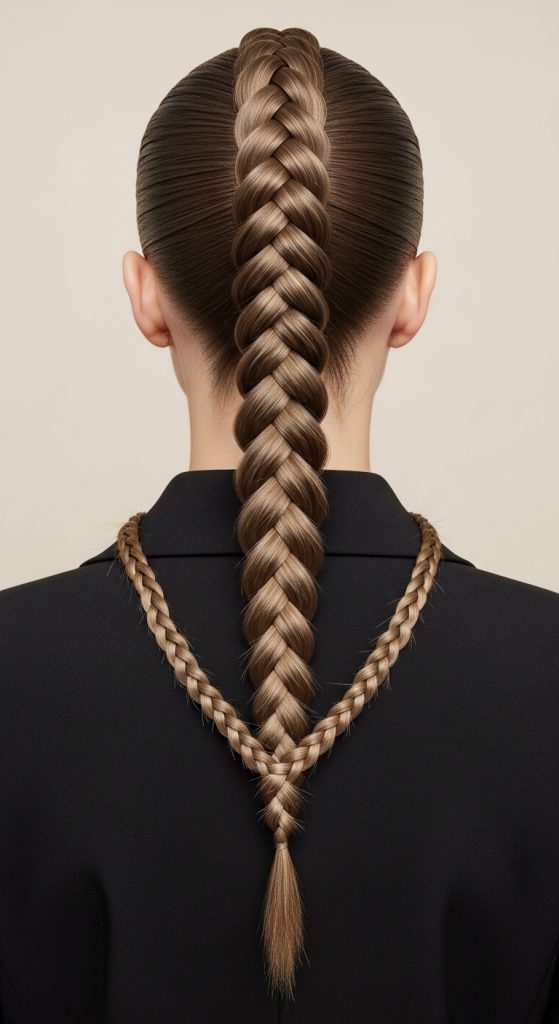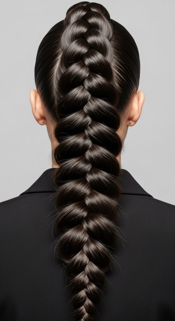 The multi-strand slick back statement braid is a complex-looking yet structured hairstyle that divides the ponytail into multiple sections for a fuller braid appearance. It is commonly seen in Pinterest ideas focused on bold creative styling and detailed hair organization. This style creates a thick, dimensional braid that stands out visually.