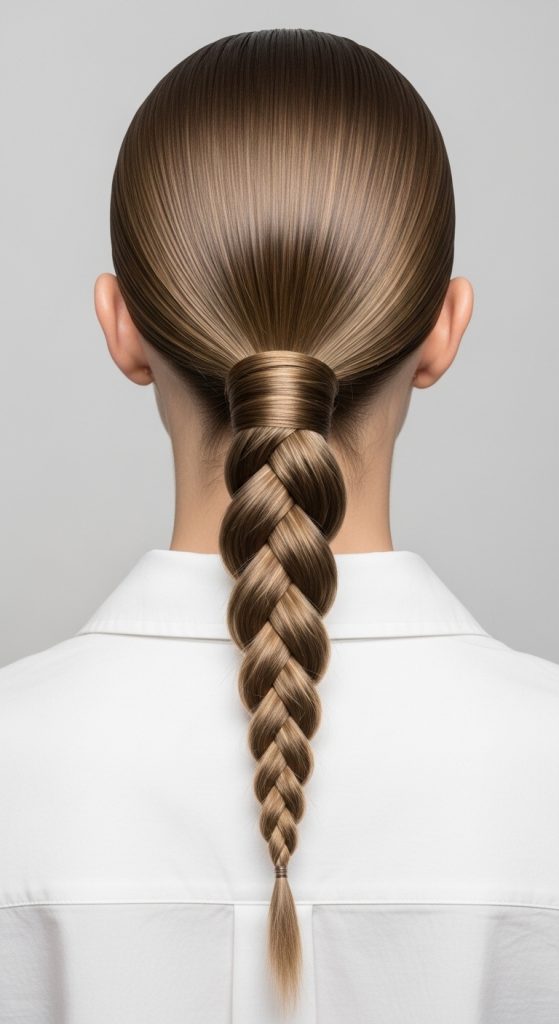 The classic sleek low ponytail braid is one of the most foundational versions of this hairstyle, often featured in Pinterest ideas focused on minimalist style and everyday elegance. It begins with a tightly controlled slick back base that sits at the nape of the neck, creating a smooth and structured silhouette. This style is widely appreciated for its simplicity and clean finish, making it suitable for both casual and formal environments. The braid itself adds subtle detail without overwhelming the overall look, which is why it remains a popular choice in beginner friendly tutorials and creative hair inspiration boards.